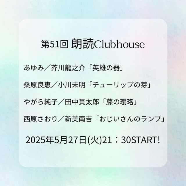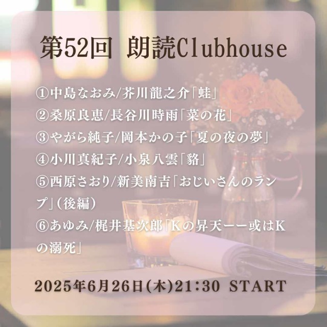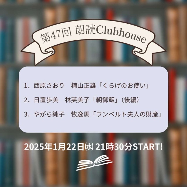 「オンライン 朗読カフェ」は、本が好きな仲間たちによるコミュニティです。雑貨屋スタッフやITエンジニア、アナウンサーなど、職業はいろいろ。年齢も暮らす場所もいろいろです。本を読みたいけれど時間がなくて…目が疲れて読めなくなってしまった…家事をしながら読書ができたら…そんな想いをお持ちの方は、ぜひオンライン朗読会を聴きにきてください。アーカイブもありますので、好きな時に聞くこともできます。無料でお楽しみいただけます!